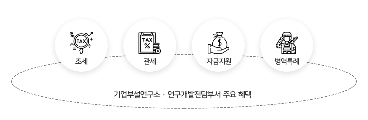 기업부설연구소 · 연구개발전담부서 설립 신고 제도는 일정 요건을 갖춘 기업부설연구소와 연구개발전담부서를 신고 · 인증함으로써 연구개발 활동에 따른 각종 조세 · 관세 · 자금 지원 및 병역 특례 등의 혜택을 부여하여 기업의 연구개발을 적극적으로 촉진 · 유도하는 제도입니다.